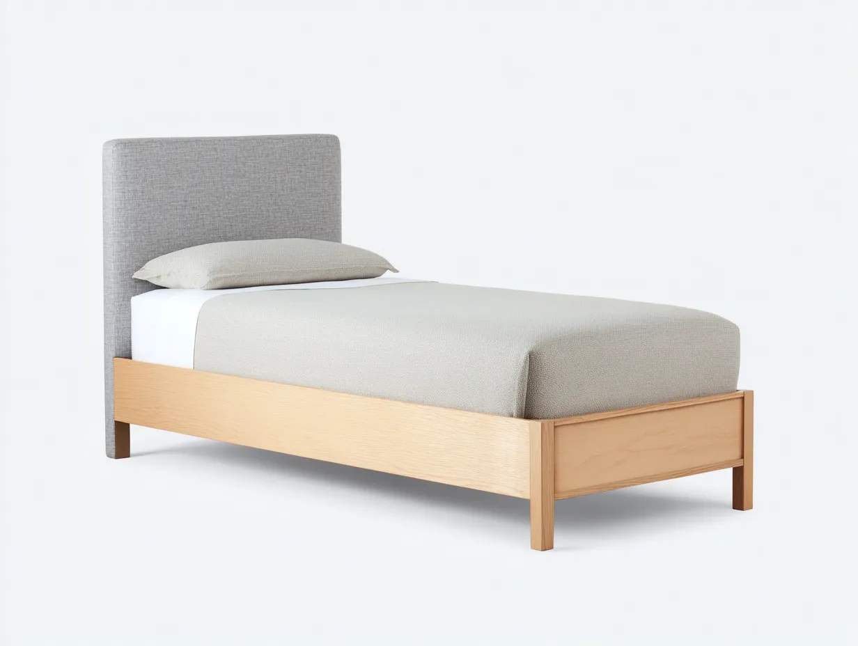 Letto singolo pensato per ambienti residenziali moderni, caratterizzato da una struttura equilibrata e da un design essenziale. La combinazione tra testiera imbottita e base in legno consente un'integrazione armoniosa in camere da letto ordinate e funzionali.